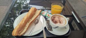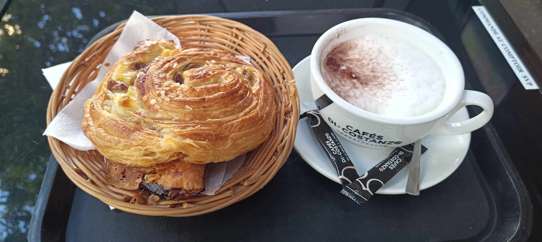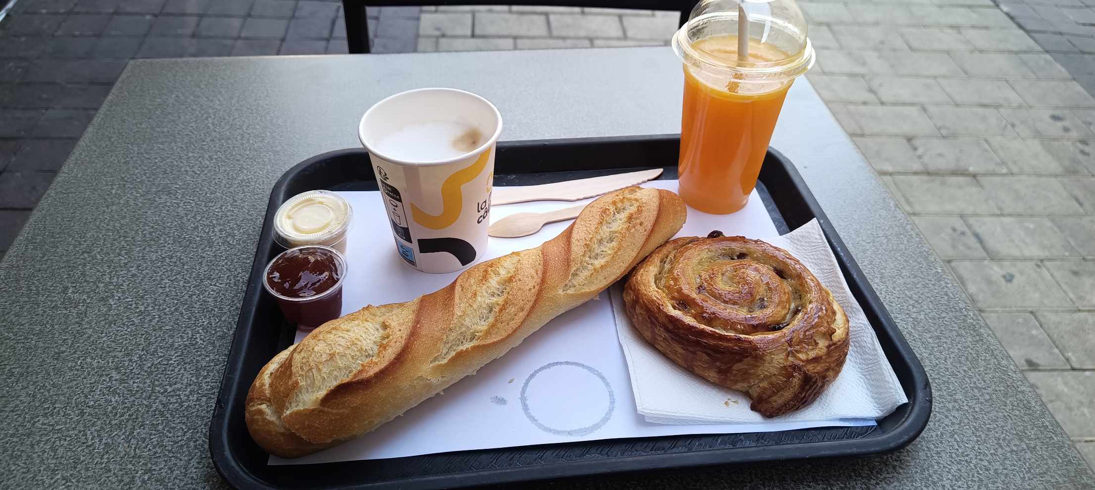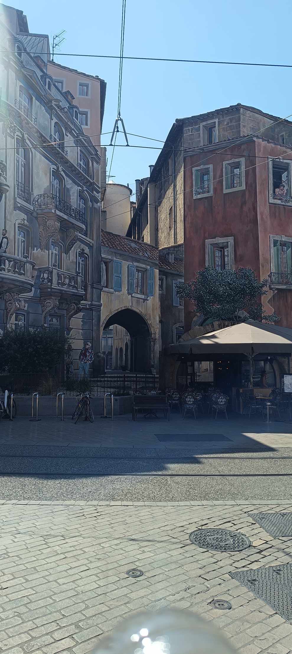Die Nacht war kurz, Viertel vor Vier war Wecken….dann los zum Busbahnhof…. der Bus hatte allerdings ca. eine Dreiviertelstunde Verspätung….er kam aus Paris…. wenigstens kam die Info aufs Handy …die Fahrt ging doch dank Nickerchen relativ schnell rum und schon war ich in Montpellier. Der Ausstieg war auch schon direkt dort, wo die Straßenbahn hält, die mich weiter befördern soll…. Tagesticket gelöst und dann war sie auch schon da und es ging Richtung Unterkunft. Da mir die Unterkunft gestern auf Rückfrage mitgeteilt hat, dass der Check-in ab 16h ist, habe ich mich auf eine Entdeckungstour vorbereitet. Zunächst einmal Frühstück…fast typisch…die Einheimischen nehmen oft wohl nur einen kurzen Kaffee… Espresso…. ich habe das kleine Frühstück genommen mit Cappuccino.