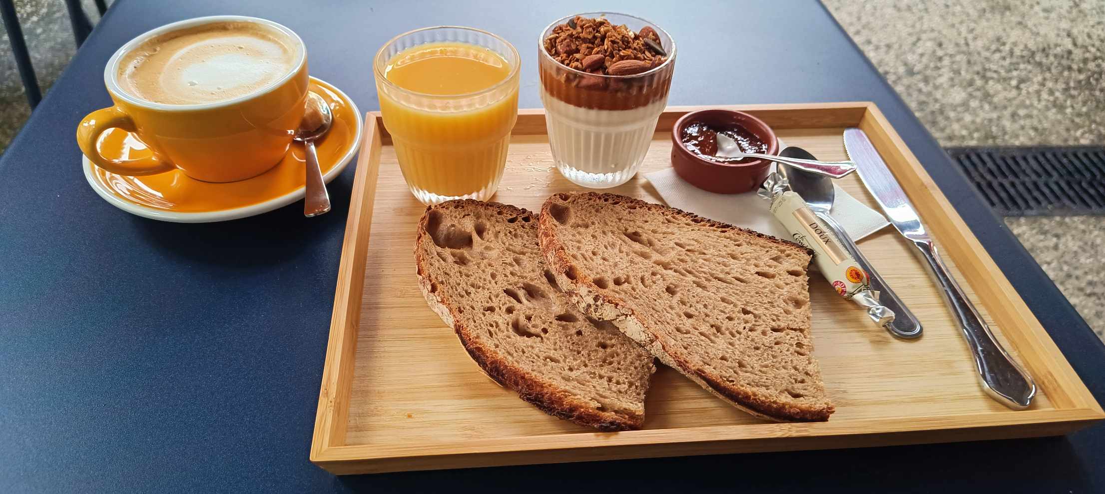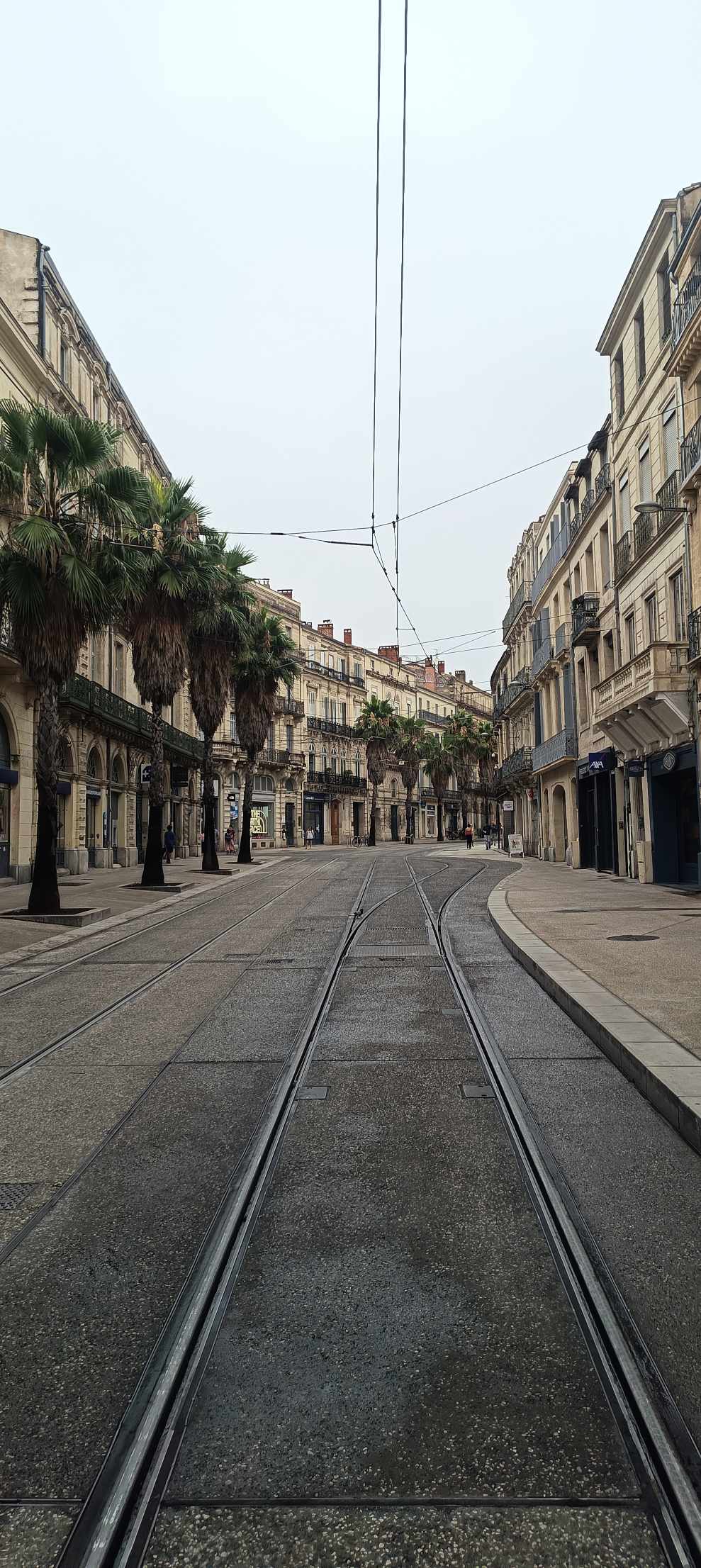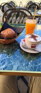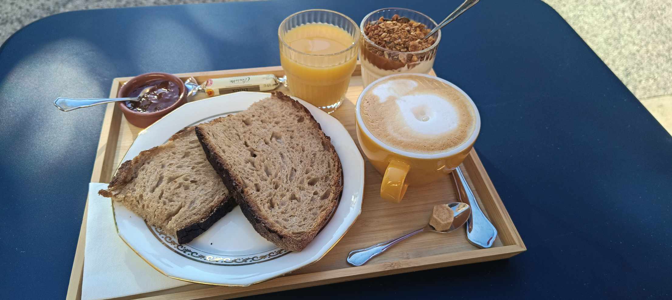 Die Nacht war kurz, Viertel vor Vier war Wecken….dann los zum Busbahnhof…. der Bus hatte allerdings ca. eine Dreiviertelstunde Verspätung….er kam aus Paris…. wenigstens kam die Info aufs Handy …die Fahrt ging doch dank Nickerchen relativ schnell rum und schon war ich in Montpellier. Der Ausstieg war auch schon direkt dort, wo die Straßenbahn hält, die mich weiter befördern soll…. Tagesticket gelöst und dann war sie auch schon da und es ging Richtung Unterkunft. Da mir die Unterkunft gestern auf Rückfrage mitgeteilt hat, dass der Check-in ab 16h ist, habe ich mich auf eine Entdeckungstour vorbereitet. Zunächst einmal Frühstück…fast typisch…die Einheimischen nehmen oft wohl nur einen kurzen Kaffee… Espresso…. ich habe das kleine Frühstück genommen mit Cappuccino.