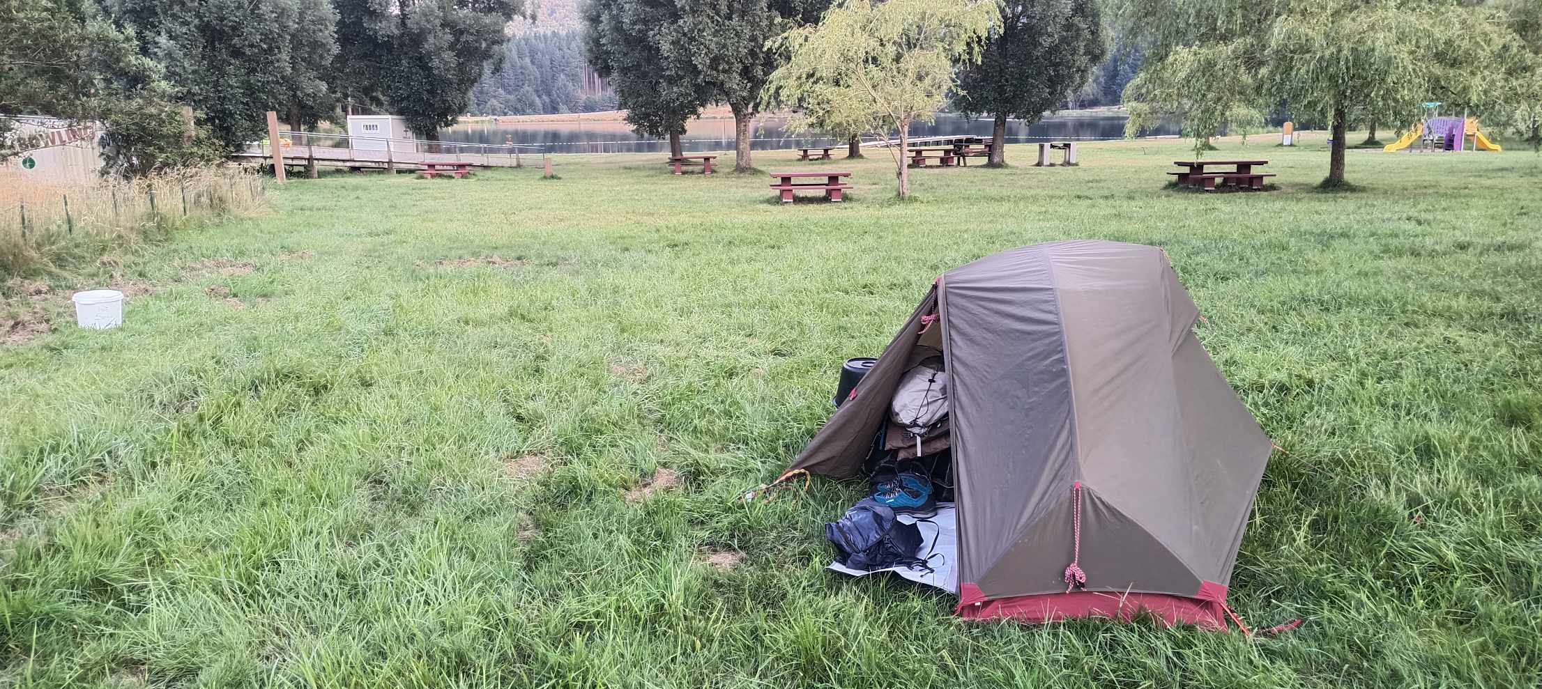 Gestern Abend hat es noch angefangen zu regnen und ich habe schnell das Überzelt montiert und die Sachen untergestellt…… Nano hatte sich unter einen Baum gestellt….kurz vor 6h bin ich aufgewacht und habe dann langsam Zelt abgebaut, Nano fertig gemacht und bin zum Caravan Camping im Örtchen zum Frühstücken und Zelt trocknen.
