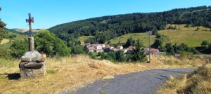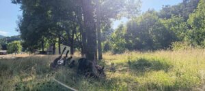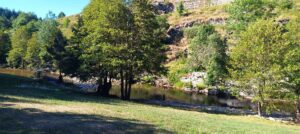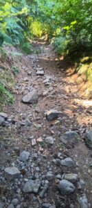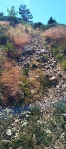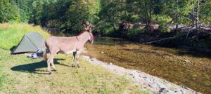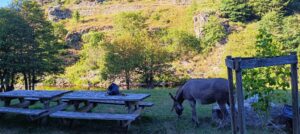 Ich lasse Nano ja wenn möglich frei laufen, wenn es die Situation erlaubt, so wie heute Morgen. Als ich dann mit dem Seil auf ihn zu kam, bewegte er sich schneller von mir weg….oh oh…der Schlingel wird doch nicht….ich habe mein Tempo gedrosselt und bin etwas in die entgegengesetzte Richtung, dann langsam seitwärts an ihm vorbei und dann auf ihn zu gelaufen …das war dann ok… Frühstück gab’s auf dem Picknick Platz….Nano ist ein Meister Bettler, wenn es um mein Essen geht …ich muss mich schon außer Reichweite setzen, sonst hört er nicht auf….und er fängt dann an auch Taschen zu durchstöbern….Karotten habe ich ja noch welche….aber ich glaube, er will auch alles andere haben…gegen 10h haben wir dann die Hufe geschwungen….Ziel war ein Campingplatz in Rieutord ….erste Hürde….eine schmale Treppe und darüber ein Haufen Ziegeln…der Weg wurde anscheinend eher selten oder gar nicht genutzt….weiter rauf konnte ich nicht schauen…ein Mann sagte mir, dass etwas weiter der bessere Aufstieg wäre….OK, dann den….mit Nano lief es ganz gut….wir spielen uns immer besser ein…er ist manchmal, aber eher selten, etwas Schreckhaft und will spontan flüchten…er sieht dann vermutlich irgendetwas….auf der anderen Seite meistert er Situationen, wo andere Esel flüchten. Heute hatte ich an ihm eine Bremse unschädlich machen wollen, da ist er sogar aufgesprungen, obwohl ihn das sonst gar nicht oder kaum tangiert…und ich habe ihm heute auch sogar eine Zecke entfernt ohne Reaktion…