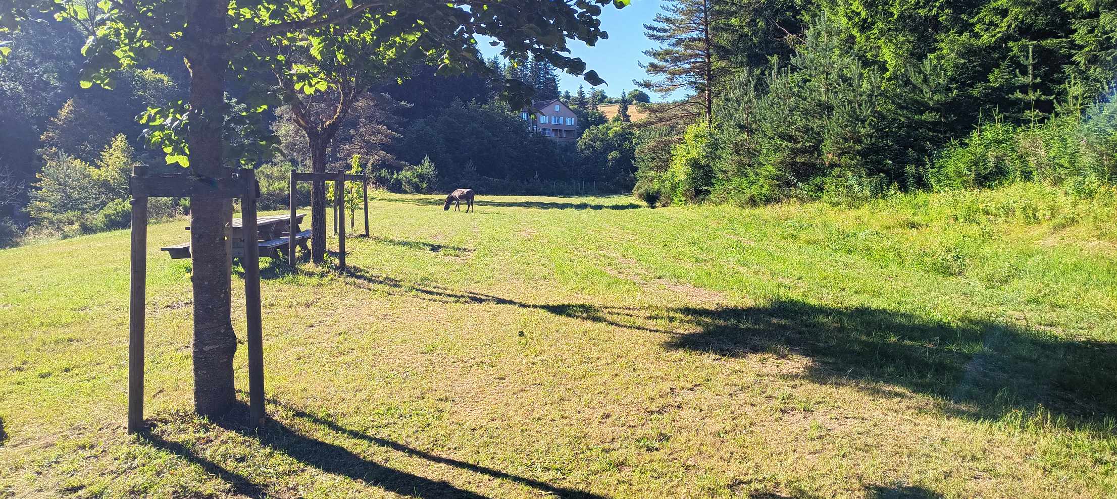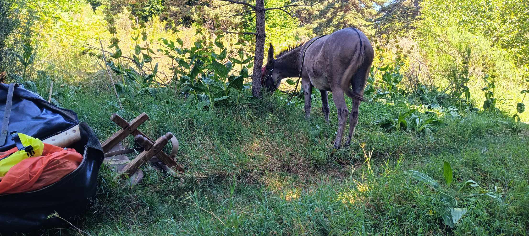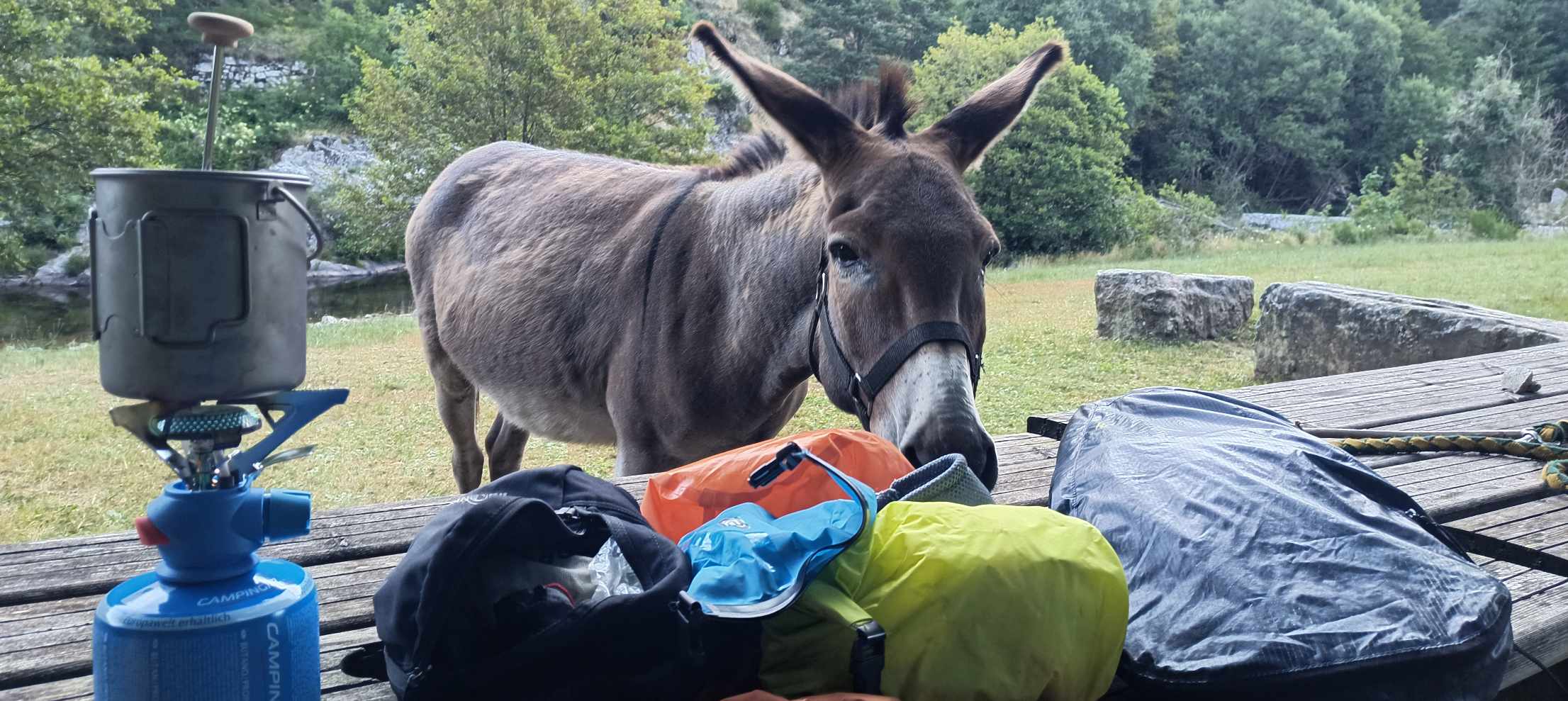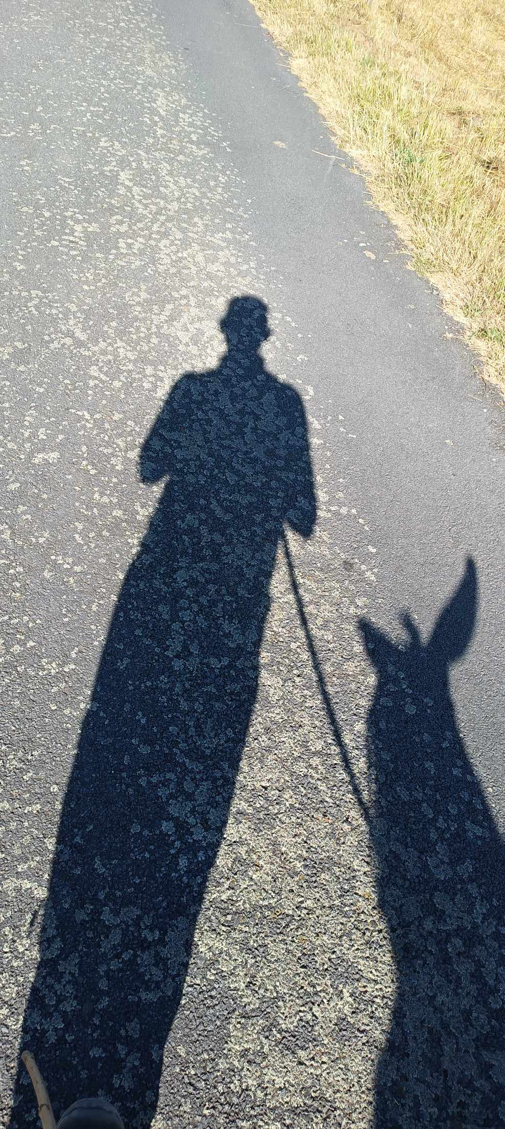Ich lasse Nano ja wenn möglich frei laufen, wenn es die Situation erlaubt, so wie heute Morgen. Als ich dann mit dem Seil auf ihn zu kam, bewegte er sich schneller von mir weg….oh oh…der Schlingel wird doch nicht….ich habe mein Tempo gedrosselt und bin etwas in die entgegengesetzte Richtung, dann langsam seitwärts an ihm vorbei und dann auf ihn zu gelaufen …das war dann ok… Frühstück gab’s auf dem Picknick Platz….Nano ist ein Meister Bettler, wenn es um mein Essen geht …ich muss mich schon außer Reichweite setzen, sonst hört er nicht auf….und er fängt dann an auch Taschen zu durchstöbern….Karotten habe ich ja noch welche….aber ich glaube, er will auch alles andere haben…gegen 10h haben wir dann die Hufe geschwungen….Ziel war ein Campingplatz in Rieutord ….erste Hürde….eine schmale Treppe und darüber ein Haufen Ziegeln…der Weg wurde anscheinend eher selten oder gar nicht genutzt….weiter rauf konnte ich nicht schauen…ein Mann sagte mir, dass etwas weiter der bessere Aufstieg wäre….OK, dann den….mit Nano lief es ganz gut….wir spielen uns immer besser ein…er ist manchmal, aber eher selten, etwas Schreckhaft und will spontan flüchten…er sieht dann vermutlich irgendetwas….auf der anderen Seite meistert er Situationen, wo andere Esel flüchten. Heute hatte ich an ihm eine Bremse unschädlich machen wollen, da ist er sogar aufgesprungen, obwohl ihn das sonst gar nicht oder kaum tangiert…und ich habe ihm heute auch sogar eine Zecke entfernt ohne Reaktion…